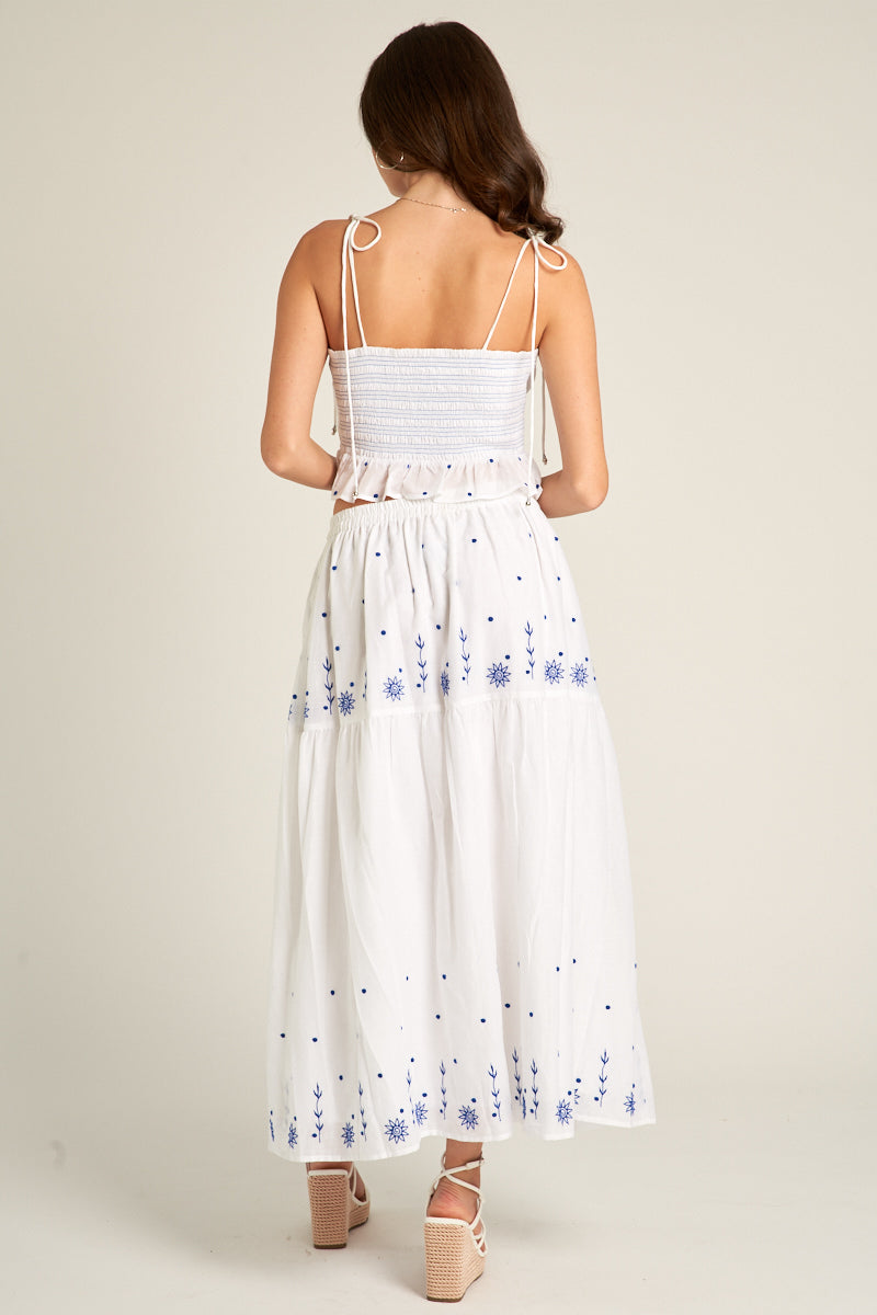- Embroidered Shoulder Tie Smocked Top